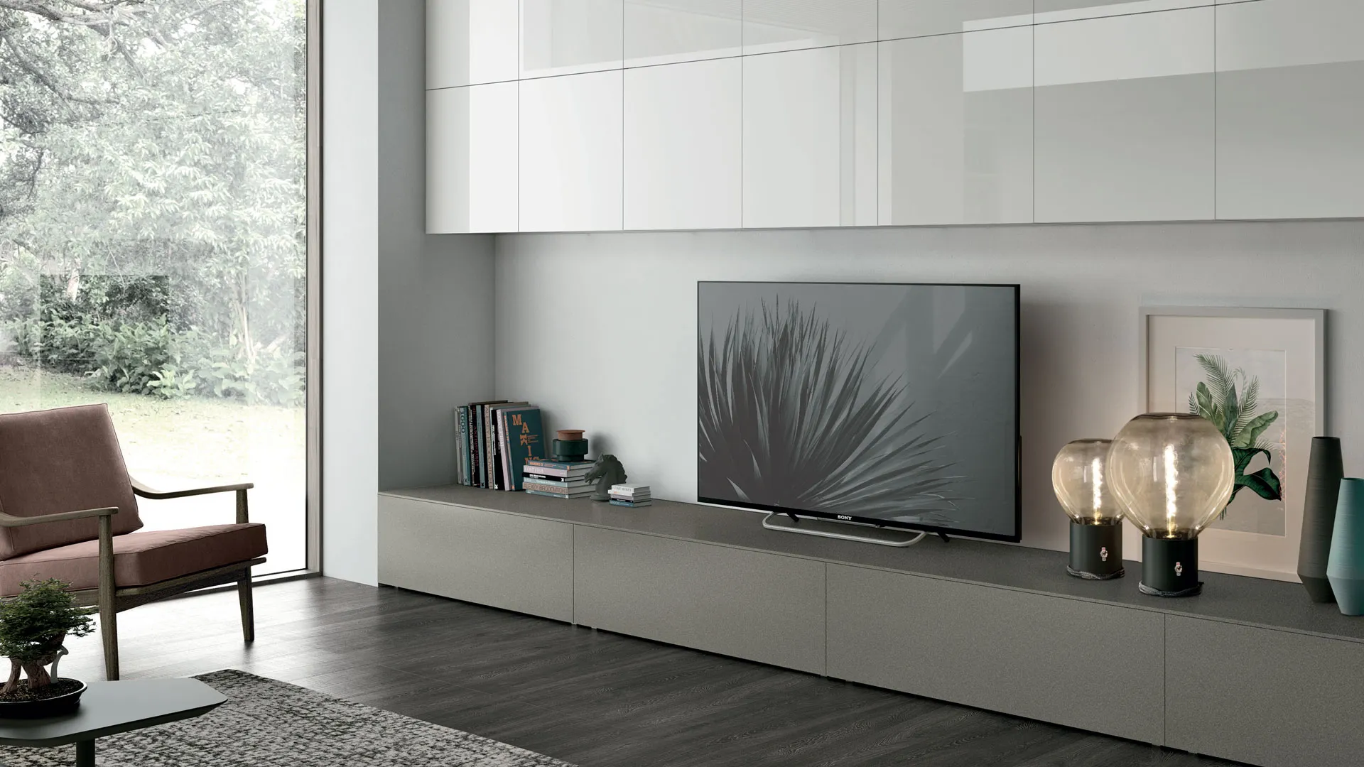 Equipped wall with Neolith® Cement Satin stone and glossy Frost glass.