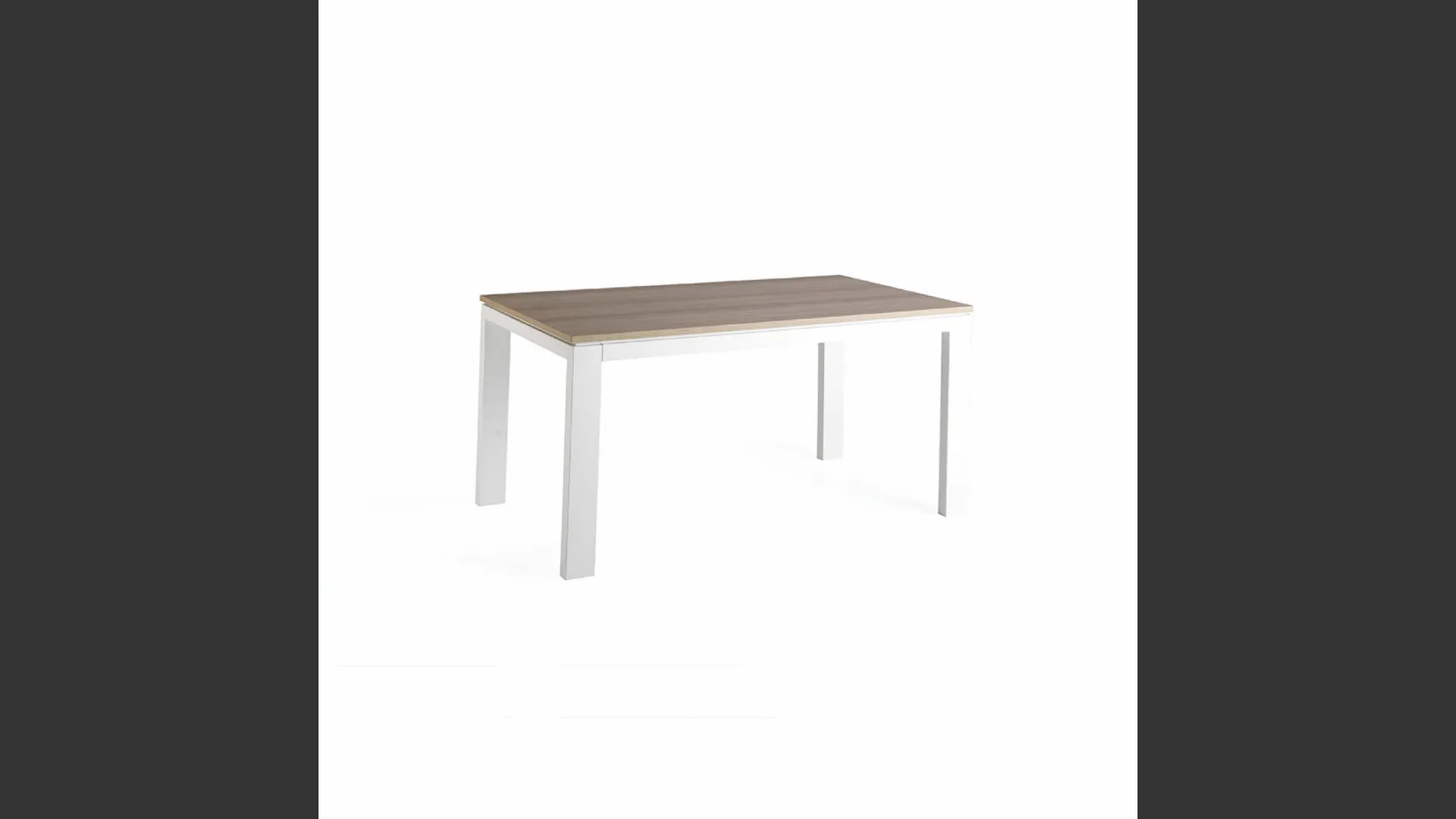 Extendable table with three 45 cm extensions. Wood-clad metal frame and painted wooden legs. 2 cm thick laminate top.