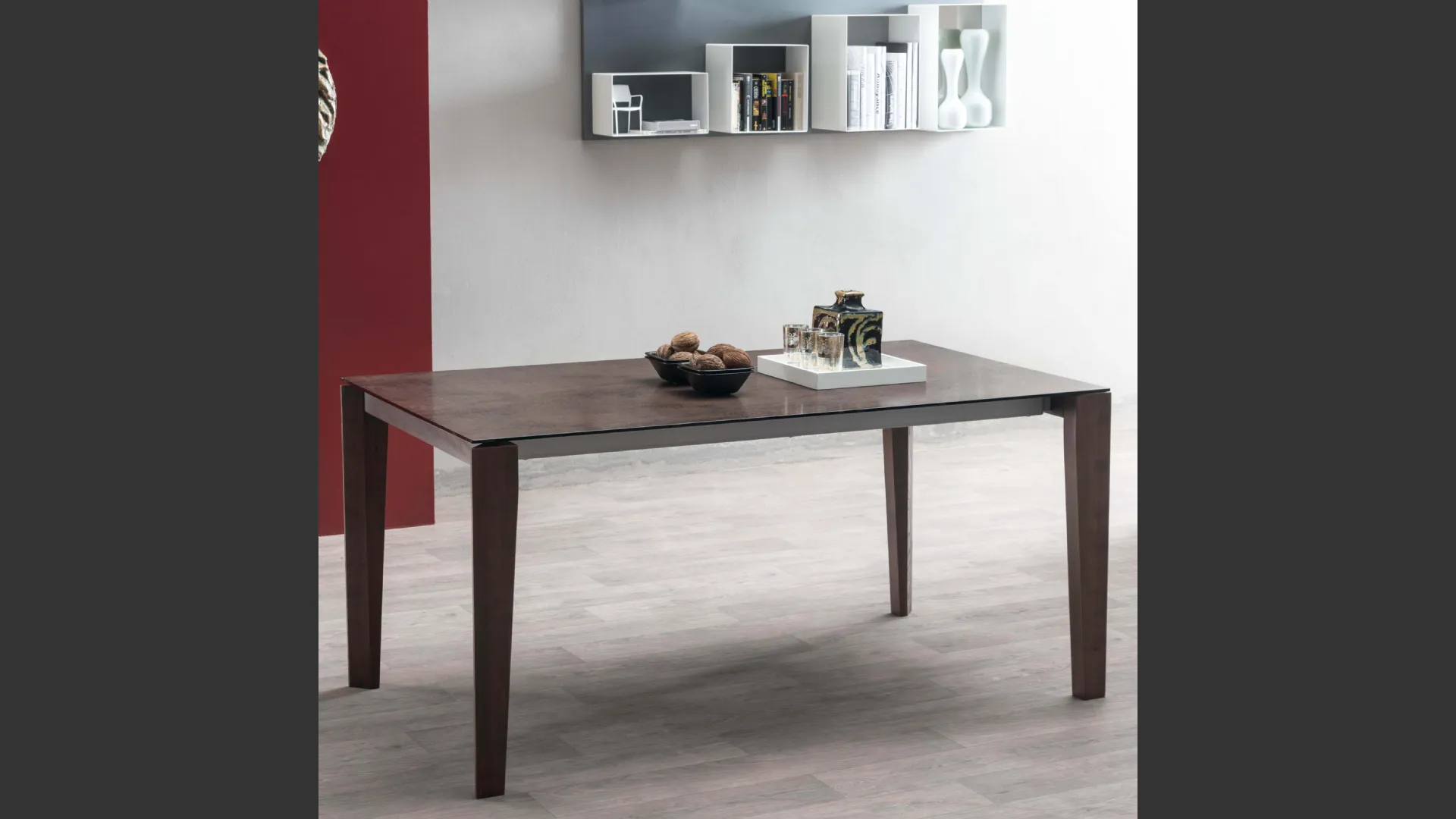 Extendable table with melamine extensions. Wooden frame and legs, glass top.