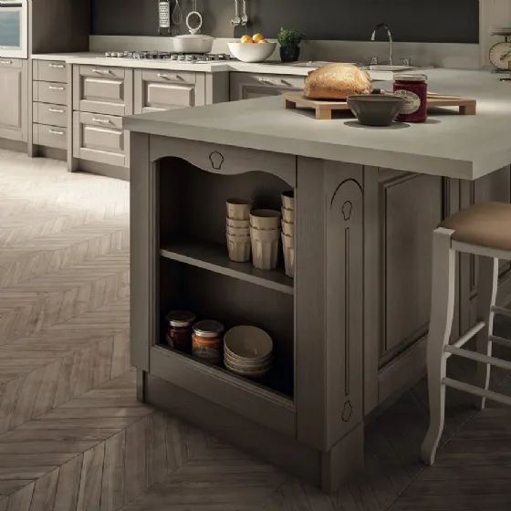 The beauty of Stosa’s Bolgheri classic kitchen also lies in its attention to detail. Just look at the delicate decorations that adorn the peninsula niches, the skillful play of solids and voids, the handles, and the finishes in rich, luminous tones—nothing is left to chance. It is precisely these details, combined with other equally precious materials such as natural stone, that further highlight the strength of wood and its expressive power, making the entire space even more inviting.