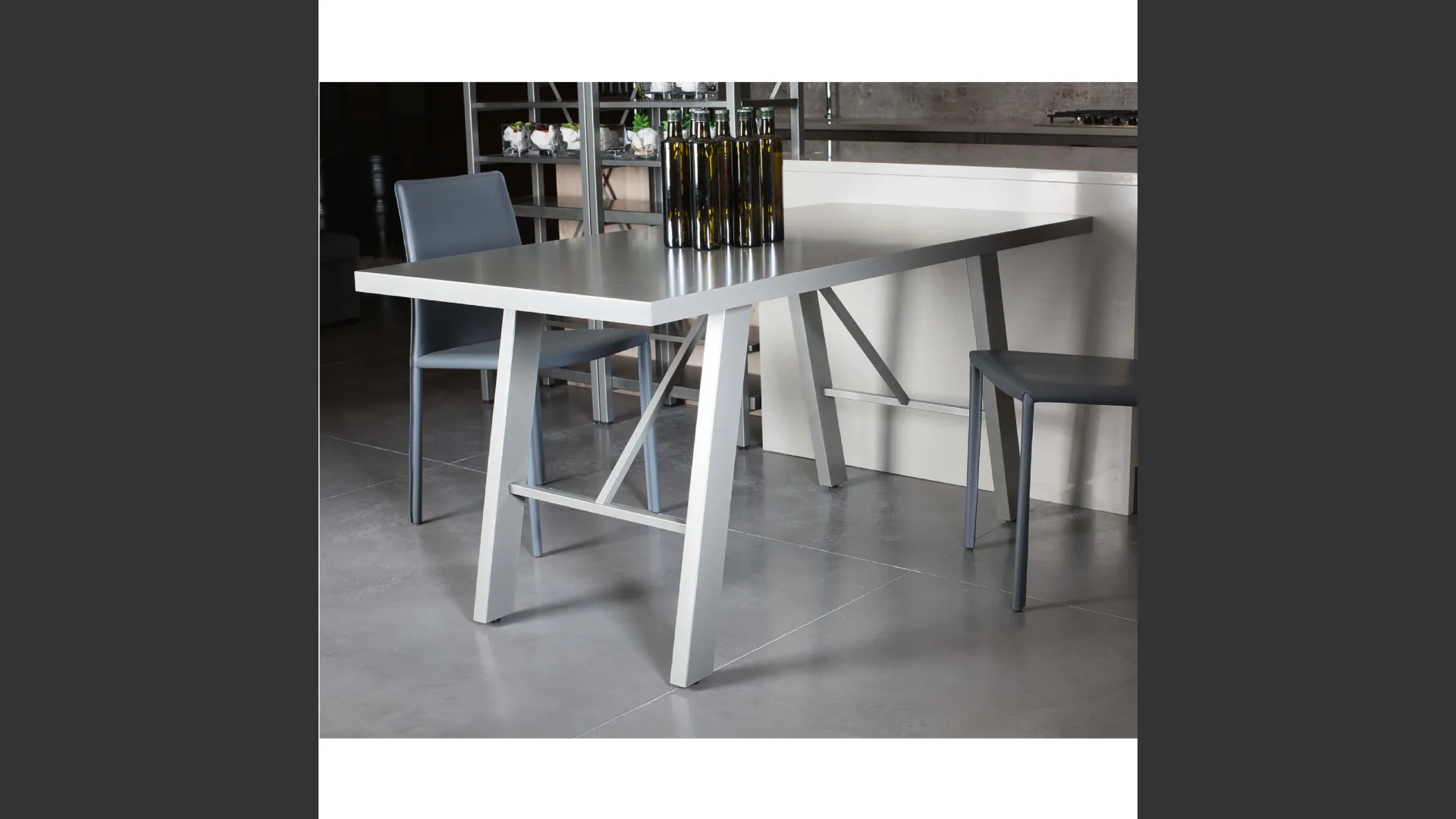 Fixed table. Painted metal frame. Top in lightweight painted metal, laminate or Fenix, 4 cm thick.