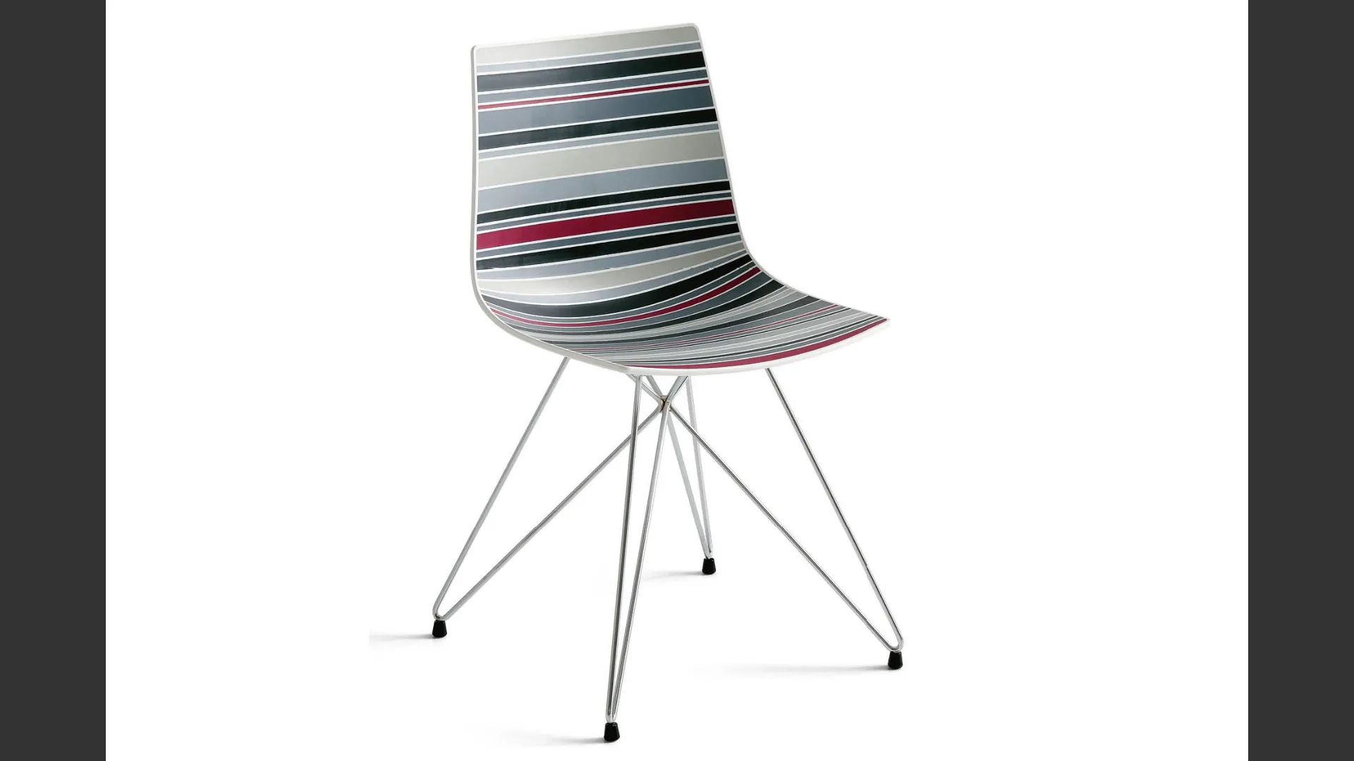Chair with white painted metal frame and technopolymer seat. Chair with black painted metal frame and technopolymer seat. Chair with chrome metal frame and technopolymer seat.