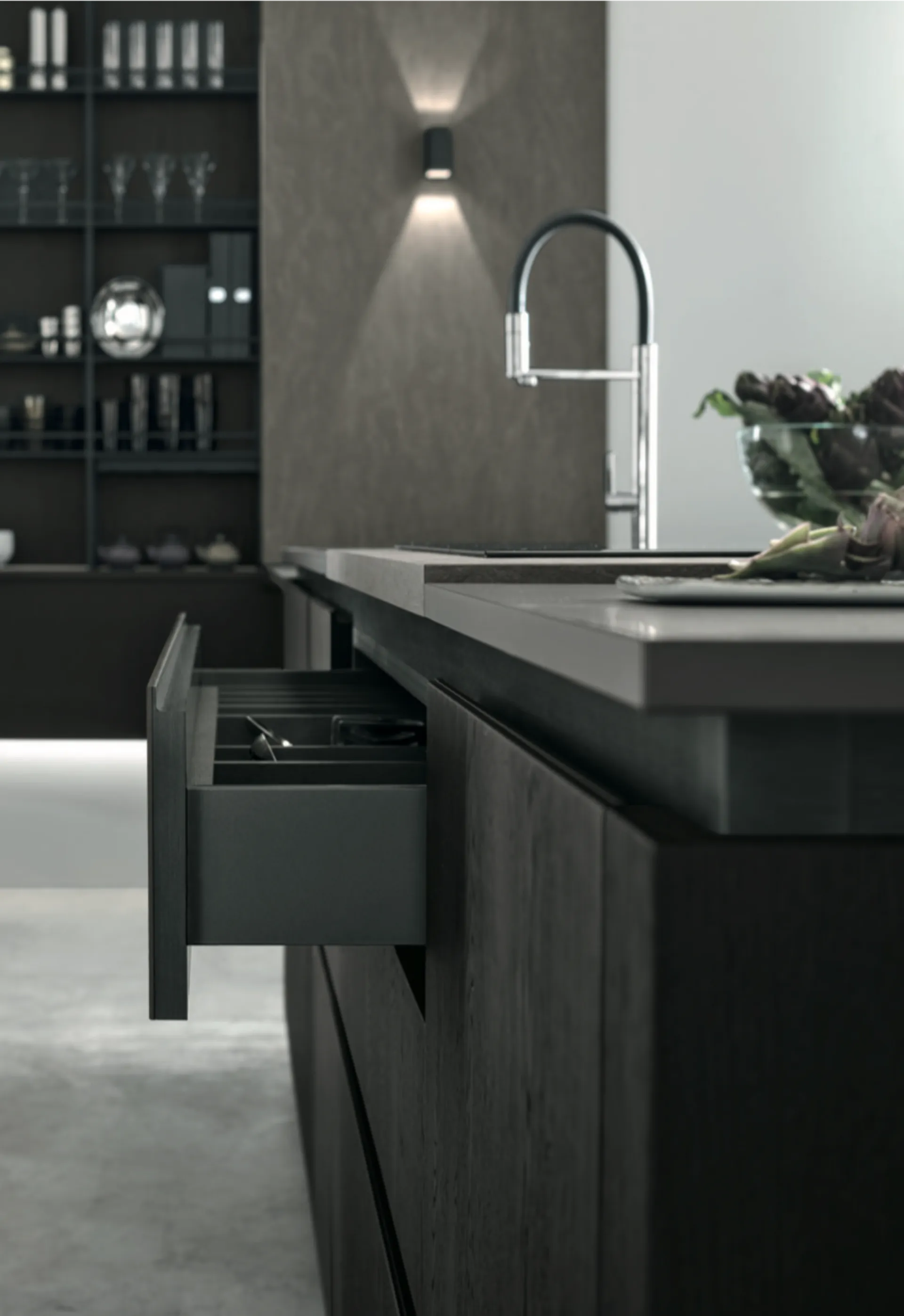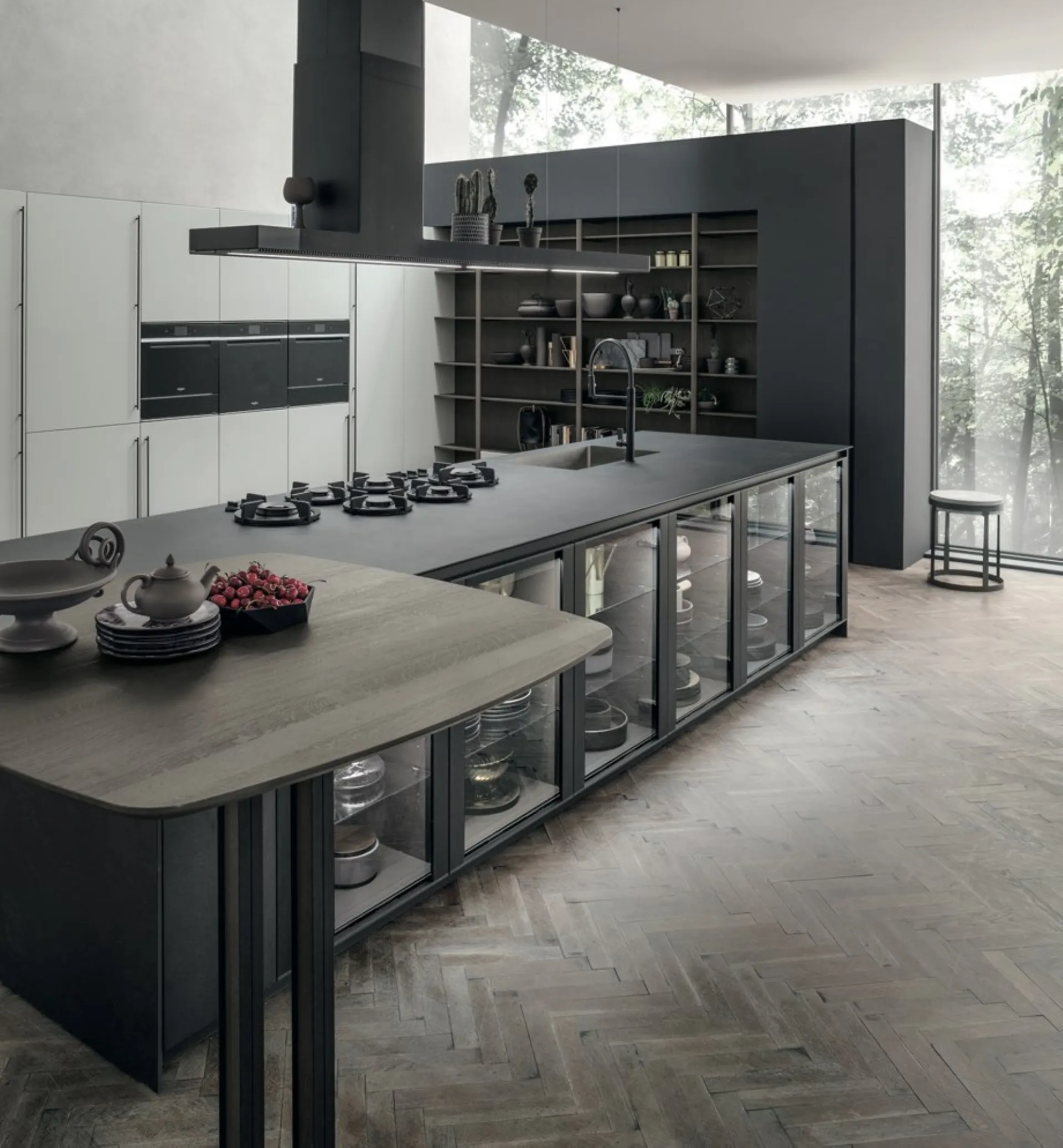 Rich wood finishes and earthy tones bring warmth and authenticity to this kitchen. A celebration of raw materials, it fuses traditional elements with contemporary design. Showcased at the Stosa Dubai showroom, it’s a go-to for those seeking natural beauty and modern functionality.